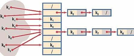 Метод цепочек – самый очевидный путь решения проблемы. В случае, когда элемент таблицы с индексом, который вернула хеш-функция, уже занят, к нему присоединяется связный список. Таким образом, если для нескольких различных значений ключа возвращается одинаковое значение хеш-функции, то по этому адресу находится указатель на связанный список, который содержит все значения. Поиск в этом списке осуществляется простым перебором, т.к. при грамотном выборе хеш-функции любой из списков оказывается достаточно коротким. Но даже здесь возможна дополнительная оптимизация. Дональд Кнут ([3], стр. 558) отмечает, что возможна сортировка списков по времени обращения к элементам. С другой стороны, для повышения быстродействия желательны большие размеры таблицы, но это приведет к ненужной трате памяти на заведомо пустые элементы. На рисунке ниже показана структура хеш-таблицы и образование цепочек при возникновении коллизий.