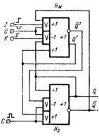 , сигнала J не действует на положительный вход Нм, связанный с элементом ИЛИ, остаётся возбуждённым, так как J=1, а тормозящий вход гасится, так как К=0. В результате Нм возбуждается, то есть Q’=1. Этот сигнал не может возбуждать Нs пока С=1. При снятии тактирующего сигнала высокий потенциал выхода Q’ поддерживает Нм в возбуждённом состоянии и одновременно возбуждает Нs, то есть получается Q=1.
