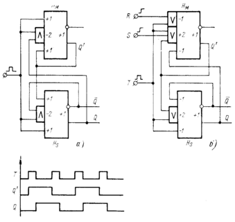 Рассмотрим триггеры со счётными входами, или так называемые Т-триггеры. В простейшем случае Т-триггер можно построить на двух RS-триггерах типа рисунка 2-2а, с добавлением некоторых входов или вентилей, как это делается обычно при построении Т-триггера на булевых элементах. Однако при этом потребуются 4-6 элементов, то есть схема получается сложной.