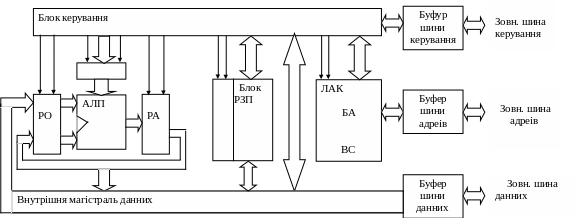 Процедура виконання операцій зараз проходить в наступній послідовності. З БК поступають сигнали “Зчитування” на вибраний РЗП і сигнал “Запис” на РО. Необхідне слово проходить через внутрішню магісталь з вибраного РЗП в РО. Одночасно з БК поступає код операції на сигнал “Запис” на РК. Після виконання операції з БК поступає сигнал “Запис”, а потім сигнал “Зчитування” на РА і сигнал “Запис” на один з РЗП, куди поступає нове слово через внутрішню магістраль.