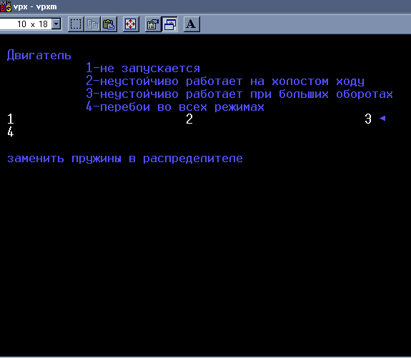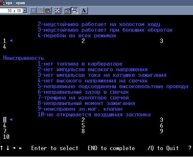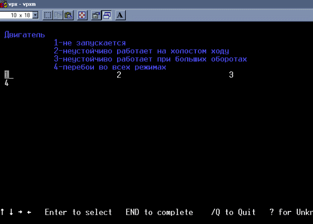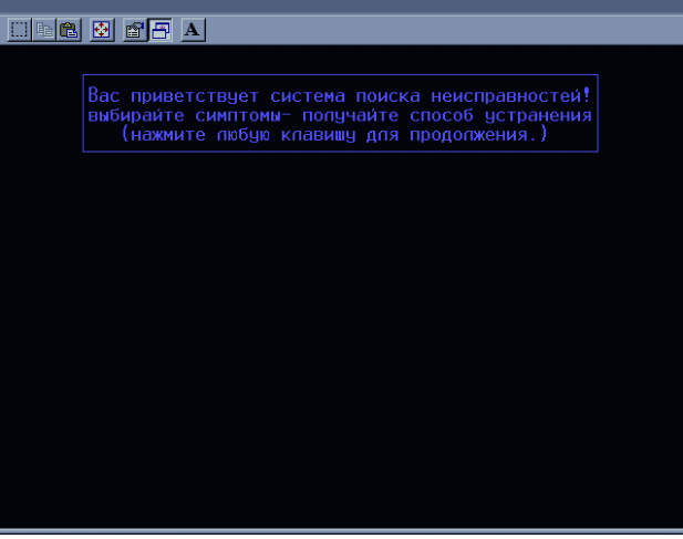 Во время работы пользователь отвечает на ряд вопросов с помощью выбора вариантов из предложенных (Enter- выбор варианта, End- продолжение работы), после чего ему предлагается способ устранения неисправности. Следующие копии экранов без комментариев показывают последовательность работы с системой.