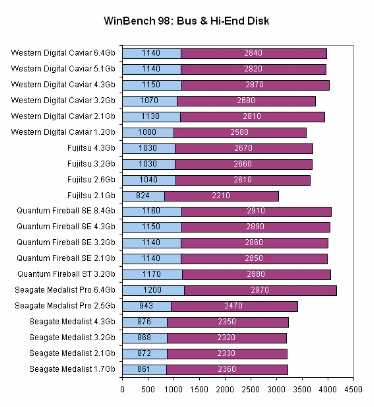 WinBench 98: Business & Hi–End Disk — программа запускает набор приложений под Windows 95 и засекает время выполнения каждого приложения. В итоге подсчитывается скорость чтения/записи данных каждым приложением. Результатом теста WinBench 98: Disk Winmark является скорость передачи данных в Кб/c.