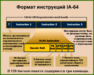 Команды в формате IA–64 упакованы по три в 128–битный пакет для быстрейшей обработки. Обычно это называют «LIW encoding» (русский аналог подобрать сложно, наиболее адекватно перевести как «кодирование в длинные слова команд»). Однако компания Intel избегает такого названия, заявляя, что с ним связаны «негативные ассоциации» (negative connotation). По той же причине Intel не любит называть сами команды RISC–подобными (RISC–like), даже несмотря на то, что они имеют фиксированную длину и предположительно оптимизированы для исполнения за один такт в ядре, не нуждающемся в микрокоде. Intel предпочитает называть свою новую LIW–технологию Explicitly Parallel Instruction Computing или EPIC (Полностью Параллельного Выполнения Команд). В любом случае формат команд IA–64 не имеет ничего общего с х86. Команды х86 могут иметь длину от 8 до 108 бит, и процессор должен последовательно декодировать каждую команду после определения её границ.