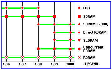 До 2000 года в мир персональных компьютеров войдет несколько новых архитектур высокоскоростной памяти. В настоящее время, с конца 1997 года по начало 1998 основная память PC осуществляет эволюцию от EDO RAM к SDRAM — синхронную память, которая, как ожидается будет доминировать на рынке с конца 1997 года. Графические и мультимедийные системы в которых сегодня применяется RDRAM перейдет к концу года на Concurrent (конкурентную) RDRAM. Итак, в период между 1997 и 2000 годом будут развиваться пять основных технологий: