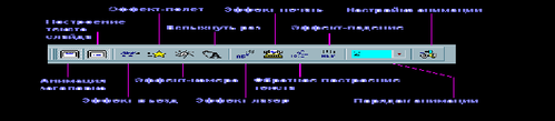 Затем для установки эффектов перехода можно использовать кнопки, поля и списки панели инструментов Сортировщик слайдов В слайд-фильме строки маркированного текста на текстовых слайдах могут появляться на экране либо все сразу, либо последовательно. Чтобы маркированный текст “выстраивался” на слайде, необходимо организовать эффект построения, выделив один или несколько текстовых слайдов с маркированным текстом, а затем выбрав тип эффекта в раскрывающемся списке Встроенная анимация текста панели инструментов Сортировщик слайдов или в диалоговом окне Настройка анимации.