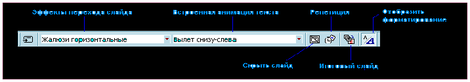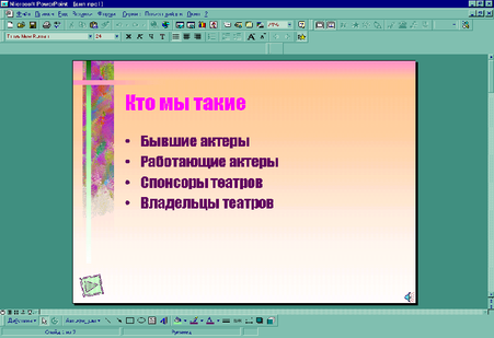 Вместо отображения отдельного статичного кадра, в данном, пятом режиме, презентация демонстрируется в динамике, слайд за слайдом, - так, как она выглядела бы при использовании стандартного проектора 35-миллимитровых фотографических слайдов. Однако, в отличие от обычных слайд-фильмов, представляющих собой простое чередование кадров, Power Point создает настоящее слайд-шоу, используя оригинальные эффекты перехода от слайда к слайду. Например, один слайд может растворяться на экране, другой – наплывать поверх предыдущего сверху вниз, причем его маркированные строки будут последовательно появляться из-за края экрана. Слайд-фильм можно дополнять переходами, построениями, эффектами анимации и даже скрывать отдельные слайды.