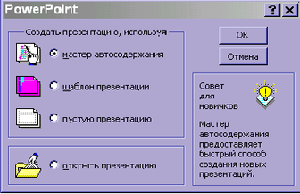При первом запуске PowerPoint пользователю предлагается ознакомиться с кратким перечнем новых возможностей этого приложения под названием “Что нового в Microsoft PowerPoint” с помощью программы визуальных примеров QuickPreview. По завершении просмотра новых возможностей раскрывается рабочее окно PowerPoint, содержащее Полезный совет в одноименном окне диалога.