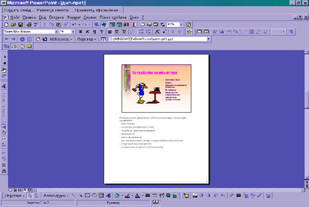 Пакет PowerPoint 7.0 для Windows 95 представляет собой последнюю версию программного обеспечения фирмы Microsoft для подготовки презентаций. Специальные средства PowerPoint существенно упрощают работу по созданию презентации, независимо от того, какими свойствами эта презентация должна обладать.