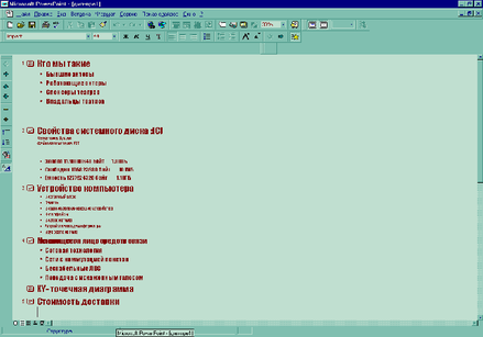 Этот режим допускает просмотр всей последовательности миниатюрных копий слайдов, расположенных равномерными рядами в окне презентации. Пользователь может проследить влияние на вид презентации в целом любого из ее общих параметров, например, шаблона, определяющего дизайн фона слайдов и их цветовую схему. Возможность изменения содержания конкретного слайда отсутствует, зато доступны средства их дублирования, удаления и изменения порядка демонстрации.