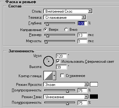 Передайте на вкладку Скос и рельеф окна Стиль слоя. Здесь определяются глубина, ширина, способ создания и другие основные параметры рельефного края.