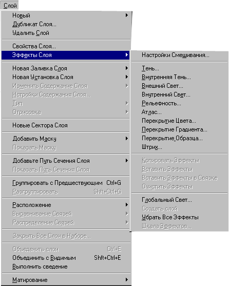 выберите команду Эффекты слоя в меню Слои и назначьте эффект с помощью открывшегося диалогового окна.