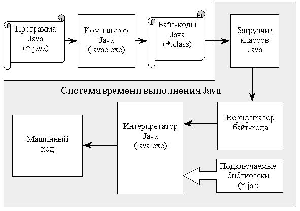 После такой проверки на безопасность байт-код интерпретируется в машинный код и запускается на выполнение интерпретатором. Причём классы, полученные локально (заслуживающие безусловного доверия), и классы, присланные по сети из остального мира (и потенциально враждебные), находятся в разных пространствах имён. При разрешении ссылки на какой-либо класс он ищется прежде всего в локальном пространстве. Это не позволяет "внешним" кодам подменить один из базовых классов в системе. Также в процессе интерпретации происходит подключение необходимых библиотек (файлы с расширением jar). Весь описанный процесс исполнения Java программ изображён на рис. 1.