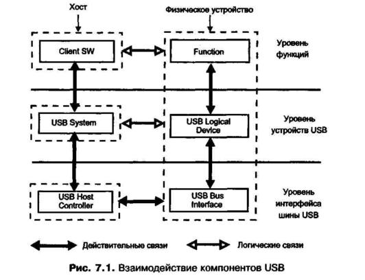 Система USB разделяется на три уровня с определенными правилами взаимодействия. Устройство USB содержит интерфейсную часть, часть устройства и функциональную часть. Хост тоже делится на три части - интерфейсную, системную и ПО устройства. Каждая часть отвечает только за определенный круг задач, логическое и реальное взаимодействие между ними иллюстрирует рис. 7.1.