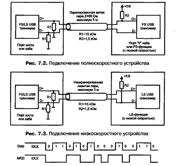 Низкая скорость предназначена для работы с небольшим количеством ПУ, не требующих высокой скорости. Скорость, используемая устройством, подключенным к конкретному порту, определяется хабом по уровням сигналов