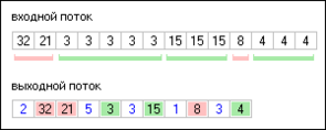 Однако в чистом виде RLE не обеспечивает полного удешевления конструкции приемного устройства. Давайте вспомним, как работает RLE. Из входного потока извлекается байт. Если он был равен предыдущему извлеченному байту (соседние байты одинаковы), тогда просто увеличивается на 1 внутренний счетчик повторов для данного байта, а в выходной поток пока ничего не сбрасывается. Как только новый извлеченный из входного потока байт отличается от предыдущего байта, в выходной поток выбрасывается СЧЕТЧИК повторов, а затем ПОВТОРЯВШИЙСЯ байт. Теперь уже начинает увеличиваться на 1 внутренний счетчик неодинаковых байт (разнобоя). Когда же во входном потоке снова будет встречен фрагмент из одинаковых байт, тогда в выходной поток будет сброшен СЧЕТЧИК разнобоя, а за ним целиком вся ПОСЛЕДОВАТЕЛЬНОСТЬ неодинаковых байт. На следующем рисунке для наглядности изображено некоторое условное содержимое входного и выходного потоков (разнобои выделены красным цветом, повторы – зеленым, синим цветом в выходном потоке обозначены поля счетчиков).