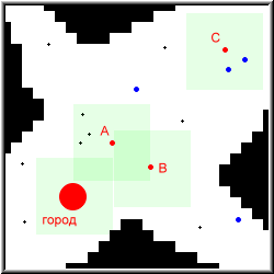 Далее хочу наглядно показать, как работает обстановочная афферентация, оперирующая областью внимания. Это отражено на приведенном ниже рисунке. Красным цветом выделены персонажи виртуального противника, синим - вражеские персонажи. Маленькие черные крестики обозначают, например, золото. Черные поля на карте - это еще не исследованные виртуальным противником земли. Зеленым цветом выделена область внимания обстановочной афферентации для каждого персонажа виртуального противника. Как было сказано, размер квадрата области внимания таков, что за один ход персонаж может достигнуть только края этого квадрата. Квадрат взят исключительно для наглядности, хотя в реальной ситуации область внимания должна напоминать круг вокруг персонажа.