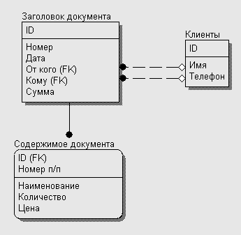 Требования к приложению описаны, и теперь можно приступить к следующему этапу – созданию БД. Нам нужны три таблицы (магическое число три выбрано исключительно для простоты): для документа, содержимого документа и справочника клиентов. Документ содержит две ссылки на справочник клиентов – “Поставщик” и "Получатель", а содержимое документа имеет ссылку на документ. На рисунке 1 представлена ER-диаграмма этой БД.