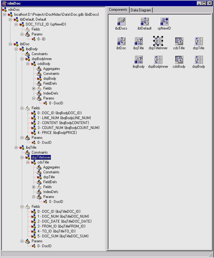 К одному компоненту транзакции ibtDoc присоединено на этот раз два запроса ibqTitle и ibqBody, соответственно выбирающих одну строку заголовка документа (select * from DOC_TITLE where DOC_ID = :DocID) и все строки этого документа (select * from DOC_BODY where DOC_ID = :DocID).