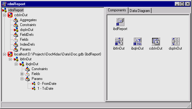 Здесь находится всего один компонент транзакции ibtInOut и один компонент запроса ibqInOut, обращающийся к процедуре отчета: