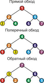 Есть три способа обхода: Прямой (preorder), Поперечный (inorder), Обратный (postorder).