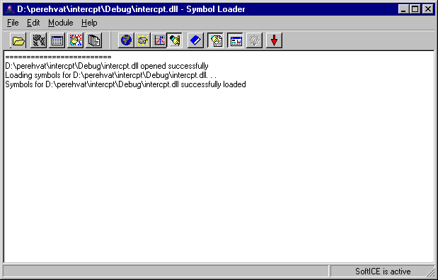 Теперь можно приступать к использованию SoftIce. Для начала нужно загрузить в отладчик символьную информацию из данной Dll, при этом сама dll еще загружена не будет. Символьная информация понадобится впоследствии, для установки точек останова и представления кодов на языке высокого уровня. Это делается при помощи утилиты Symbol Loader из комплекта SoftIce.