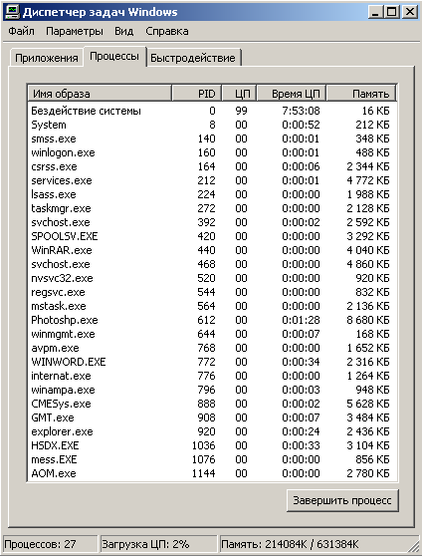 Запустите программу-жертву (в нашем случае это MESS.EXE). Откройте Диспетчер задач, найдите в нем запущенный процесс (mess.exe):