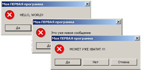 Чтобы опробовать все вышесказанное в деле, сначала подыщите на своем компьютере какое-либо приложение, имеющее в своем составе окна сообщений типа MessageBox. Подопытное приложение написано нами самими, оно называется MESS.EXE и выводит друг за другом три окна сообщений, коллаж из которых показан на рисунке:
