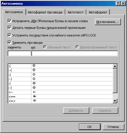 Выбрать команду Сервиз\Автозамена. Появится диалоговое окно Автозамена