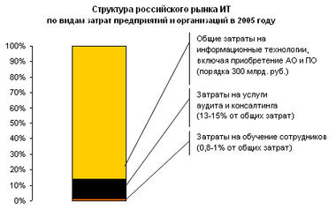 По оценкам CNА, российский ИТ-рынок в 2005 году вплотную приблизился к отметке в 300 млрд.руб. Примерно 250 млрд. руб. было потрачено на закупку нового программного обеспечения и аппаратных средств, около 46 млрд. руб. израсходовано на оплату услуг ИТ-аудита и ИТ-консалтинга и, наконец, немногим менее 3 млрд.руб. предприятия и организации инвестировали в повышение квалификации своих сотрудников в сфере ИТ (ИТ-обучение), что отчетливо видно на рисунке 1.