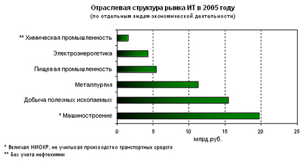 По-настоящему массовыми заказчиками ИТ этого уровня являются торговые компании, банки, предприятия сферы услуг. Но вот с реальным сектором экономики — сектором, который мог бы придать рынку принципиально новую динамику — дела обстоят не так хорошо. Накопленные CNA [http://www.cnews.ru/reviews/free] за прошлые годы данные показывают, что машиностроительные предприятия пока не слишком активно что-либо внедряют, хотя в целом отрасль демонстрирует весьма неплохие показатели по числу проектов. Это происходит в основном за счет инициатив предприятий-экспортеров, которые представляют собой своеобразные «маяки» отечественного реального сектора экономики. Оценивая его «информационно-технологическую емкость» всегда следует помнить, что такие предприятия как ОАО «КнААПО», «НПК Иркут», ЧНППП «Элара» или УМПО представляют исключения из общей картины.