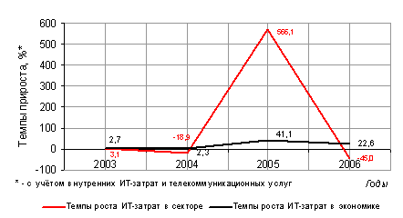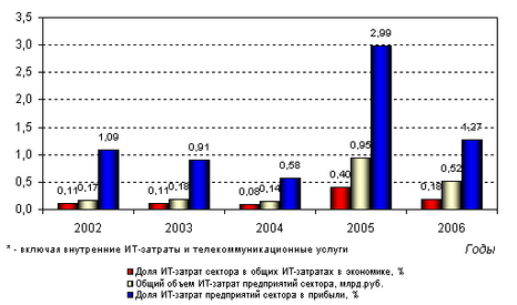 В 2005 г. госстатистикой был зафиксирован рост ИТ-расходов в секторе в 566%. На рубеже 2004-2005 гг. ИТ-затраты предприятий общепита выросли с 140 до 950 млн руб. До этого темпы были ещё более неопределенные — в 2003 году скромные 3% роста, в 2004-м — падение почти на 19%. Таким образом, до 2005 года доля средств, расходуемых в секторе общественного питания на ИТ составляла 0,6-1% от валовой прибыли предприятий, что, как уже говорилось, один из самых низких показателей по экономике. В 2006 году расходы снова резко упали (по предварительным оценкам — на 45%), и хотя это выглядит закономерным (как правило, за резким «взлетом» следует «провал»). Следует констатировать, что сегодняшний уровень ИТ-расходов сопоставим с уровнем 2002 года. Таким образом, на протяжении периода 2002-206 гг. можно говорить скорее о стагнации спроса на ИТ в секторе общественного питания, нежели о каких-либо тенденциях развития. Скорее всего, внедрения происходят локальные и большей частью «разовые», без особых усилий по дальнейшему развитию ИТ-инфраструктуры предприятий