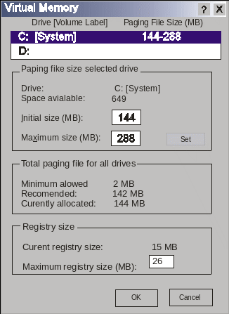 Физическую память следует рассматривать как данные, хранимые в дисковом файле со страничной структурой. Поэтому, когда приложение передает физическую память какому-нибудь региону адресного пространства (вызывая VirtualAttoc), она на самом деле выделяется из файла, размещенного на жестком диске. Размер страничного файла в системе — главный фактор, определяющий количество физической памяти, доступное приложениям. Реальный объем оперативной памяти имеет гораздо меньшее значение. Физическая память в страничном файле не хранится Windows 2000 может использовать несколько страничных файлов, и, если они расположены на разных физических дисках, операционная система работает гораздо быстрее, поскольку способна вести запись одновременно на нескольких дисках. Чтобы добавить или удалить страничный файл, откройте в Control Panel апплет System, выберите вкладку Advanced и щелкните кнопку Performance Options. Нa экране появится следующее диалоговое окно.
