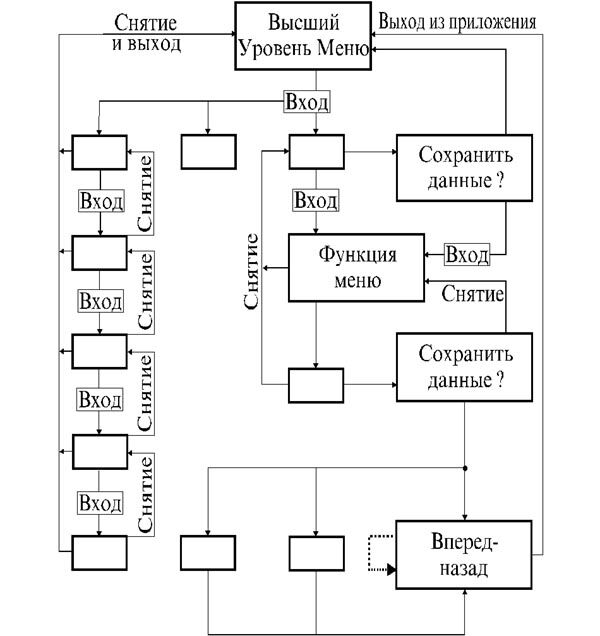 Здесь иллюстрируются возможности навигации типичного диалога при переходах от панели к панели, которые изображены прямоугольниками. Операции Вперед и Назад являются операциями прокрутки, а не навигационными, и используются для передвижения внутри панелей.