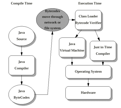 Java Runtime Environment содержит специальные средства проверки кода, обеспечивающие надежность и защищенность программ, загрузчик классов, который динамически загружает классы в процессе выполнения и виртуальную машину Java (Java VM), которая выполняет последовательность байт-кодов, взаимодействую с конкретной операционной системой. Такой подходт освобождает разработчика от необходимости обращать внимания на специфику какой-то конкретной операционной системы и позволяет внедрять Java-приложения на более чем одной платформе. Компоненты JavaRuntime Environment показаны на следующей диаграмме.