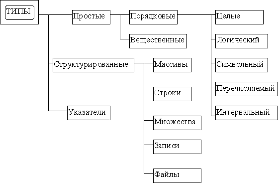 Различают переменные следующих простых типов: целые (Integer, Byte, ShortInt, Word, LongInt), вещественные (Real, Comp, Double, Single, Extended), логический (Boolean), символьный (Char), перечисляемый, диапазонный.
