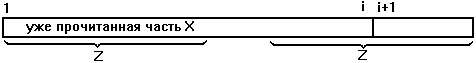 одновременно являющиеся его концами -из них нам надо брать самое длинное. Откуда берутся эти начала? Каждое из них (не считая пустого) получается из некоторого слова Z' приписыванием буквы x[i+1] . Слово Z' является началом и