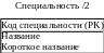 | 2 | Код специальности | Kod spec | FK | NUMERIC | 5 |