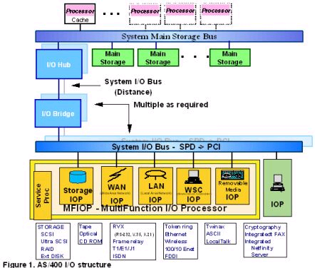 Первые системы семейчтва AS/400 комплектовались только одним таким процессором. На рисунке отчетливо видно, что на одном процессоре ввода/вывода (IOP) находится шина PCI со множеством устройств.