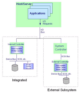 Система хранения данных состоит из двух основных частей – встроенной системы и внешней, основанной на шине SCSI. Архитектура встроенной системы более совершенна, нежели чем внешняя и позволяет делать замену неисправных дисков, кэшей и прочего оборудования без потери данных и отключения всей системы. При подключении дисков к внешней системе (SCSI) приходится дополнительно каждый раз конфигурировать систему заново. Еще одно существенное отличие встроенной системы от внешней – система кэширования запрашиваеммых данных. Она позволяет выполнять однотипные операции чтения данных с фантастической скоростью. Также встроенная система позволяет осуществлять расширенный мониторинг дисков, соединений и всей системы хранения вцелом.