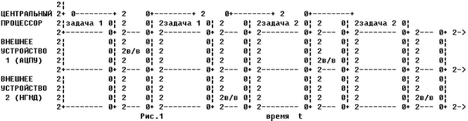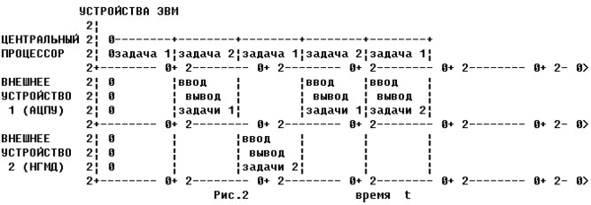 МНОГОПРОГРАММНЫЙ РЕЖИМ - МУЛЬТИПРОГРАММНЫЙ режим, в котором несколько независимых друг от друг программ выполняют обработку данных одновременно.При этом программы делят ресурсы ЭВМ между собой. Основой мультипрограммного режима является совмещение во время работы центрального процессора и выполнение операций периферийных устройств. Достоинство этого режима перед однопрограммным режимом более эффективное использование ресурсов ЭВМ и повышение ее пропускной способности. На рисунке 2 изображена диаграмма работы двух программ в мультипрограммном режиме.
