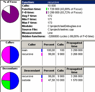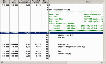 Обратите внимание на количество и последовательность вызова различных модулей потока «main». Жирная линия показывает наиболее длительные ветви (содержащие либо часто вызываемые функции, либо функции, выполнявшиеся дольше остальных). Для демонстрации возможностей Quantify было сконструировано простое приложение, состоящее из функции «main» и двух дополнительных «recursive» и «outside» (см. листинг 1).