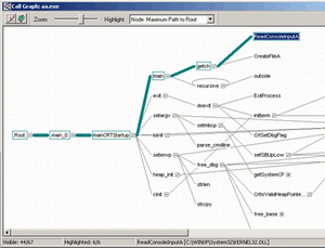 Следующий интереснейший способ анализа конструкции приложения — это просмотр дерева вызовов. Окно, показанное на 4 рисунке, показывает только фрагмент окна с диаграммой вызовов.