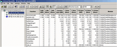 Для осуществления не пустого сравнения, в пример, рассмотренный выше, намеренно были внесены изменения, увеличившие число вызовов функций. Данные были сохранены и перекомпилированы и снова исполнены в Quantify. Результат представлен на рисунке: