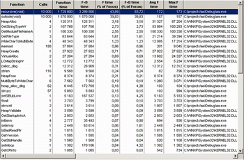 Одно из наиболее важных статистических окон. Здесь в табличном виде выводится статистическая информация по числу и времени работы каждой функции. Рисунок 6 демонстрирует окно с включенной сортировкой по числу вызовов каждой функции. В качестве дополнительной информации включен список формальных параметров вызовов функций. Подобную информацию можно получить только в том случае, когда тестируется модуль с отладочным кодом, к которому прилагается исходный текст.