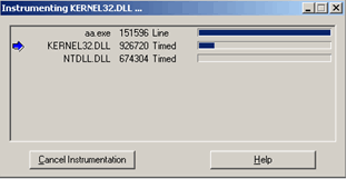 Начало насыщения тестируемого приложения сопровождается появлением окна инструментирования, в котором построчно отображаются все модули, вызываемые основным. Данные модули, как говорилось выше, насыщаются отладочным кодом и помещаются в специальную директорию «cache» по адресу «\rational\quantify\cache». Отметим, что первоначальный запуск инструментирвания процесс длительный, но каждый последующий вызов сокращает общее время ожидания в силу того, что вся необходимая информация уже есть в Кеше.