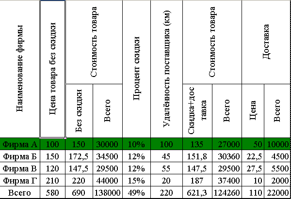 | Наименование фирмы | Цена товара без скидки | Стоимость товара без скидки | Процент скидки | Удалённость поставщика (км) | Стоимость со скидкой и доставкой |