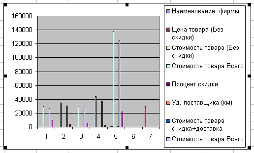 Построить гистограмму. На оси Х отложены фирмы, по левой оси У - «стоимость товаров без скидки» и «стоимость со скидкой и доставкой» по правой оси У – «удаленность поставщика».При выполнении вычислений все значения округлить до сотен.