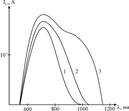 На рисунке 4 приведены типичные кривые спектрального распределения тока короткого замыкания гетеропереходов с различным химическим составом базового слоя. [3].