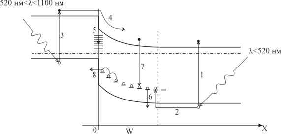 При фотовозбуждении квантами из области собственного поглощения сульфида кадмия появляются неравновесные электроны и дырки (переходы 1). Электроны удаляются полем барьера в объем базовой области, а дырки захватываются вблизи границы раздела на ловушки и центры рекомбинации (переходы 2). Наличие таких компенсирующих центров с большой концентрацией фактически является одним из основных свойств рассматриваемого гетероперехода. Поле барьера способствует накоплению дырок в ОПЗ, поэтому даже при незначительном уровне фотовозбуждения распределение положительного заряда в CdS значительно изменяется, что приводит к росту емкости перехода. Кроме того, распределение энергии электрона от координаты изменяется с квадратичного на экспоненциальное. При этом резко возрастает напряженность электрического поля у границы раздела гетероперехода [3].