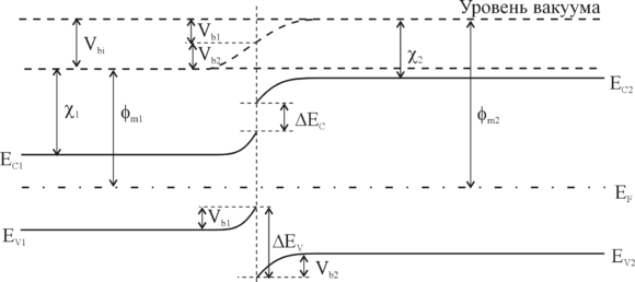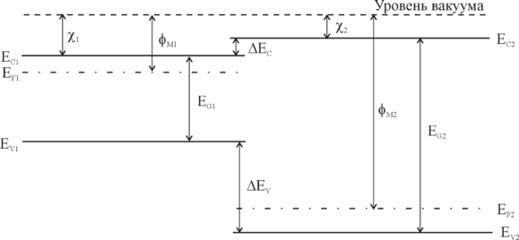 Работа выхода и электронное сродство определяются как энергия, необходимая для удаления электрона с уровня Ферми Еf и со дна зоны проводимости Еc в вакуум соответственно. Различие в положении дна зоны проводимости полупроводников обозначено Еc; а различие в положении потолка валентной зоны ΔEv. На рисунке 1 показан случай, когда ΔЕc=(χ1-χ2).